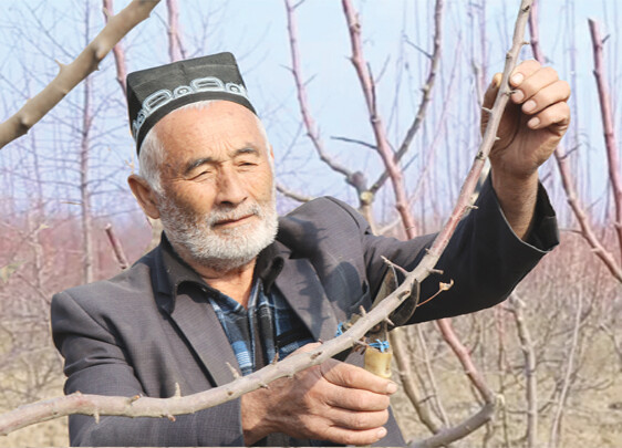 Суратда: қўнғиротлик боғбон Убайдилло Бўтаев боғда.