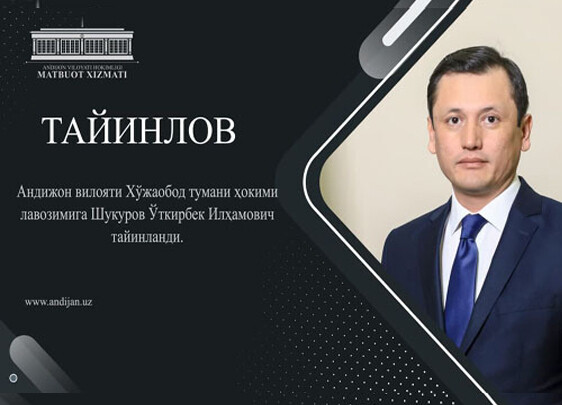 ШУКУРОВ ЎТКИРБЕК ИЛХАМОВИЧ АНДИЖОН ВИЛОЯТИ ХЎЖАОБОД ТУМАНИ ҲОКИМИ ЛАВОЗИМИГА ТАЙИНЛАНДИ.