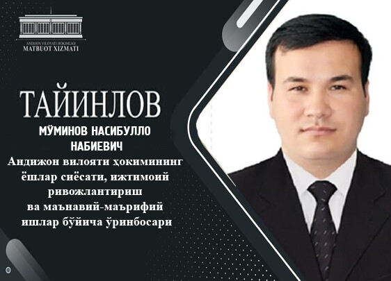 Андижон вилояти ҳокимининг ёшлар сиёсати, ижтимоий ривожлантириш ва маънавий-маърифий ишлар бўйича ўринбосари лавозимига Мўминов Насибулло Набиевич тайинланди. Н. Мўминов 1983 йилда Андижон туманида таваллуд топган. 2006 йилда Андижон муҳандислик иқтисодиёт институтини тамомлаган. Меҳнат фаолиятини 2001 йилда Андижон қурилиш техникумининг махсус фан ўқитувчиси вазифасидан бошлаган. 2003-2015 йилларда Андижон уй-жой ва коммунал хўжалиги касб-ҳунар коллежида бўлим бошлиғи, амалиёт ишлари бўйича, ўқув ишлари бўйича директор ўринбосари бўлиб ишлаган. бошқармаси бошлиғи вазифаларида фаолият юритган. 2015-2017 йиллар давомида Андижон қурилиш ва транспорт касб-ҳунар коллежининг директори, 2017- 2018 йилларда Ўзбекистон Республикаси Вазирлар Маҳкамаси ҳузуридаги Таълим сифатини назорат қилиш давлат инспекцияси Андижон вилояти бўлими бошлиғи, 2018-2019 йиллар давомида эса Андижон вилояти ҳокимлиги касб-ҳунар бошқармаси бошлиғи вазифаларида фаолият кўрсатган. Тайинловга қадар Н.Мўминов Андижон вилояти Касбий таълимни ривожлантириш ва мувофиқлаштириш бошқармаси бошлиғи лавозимида ишлаб келган.